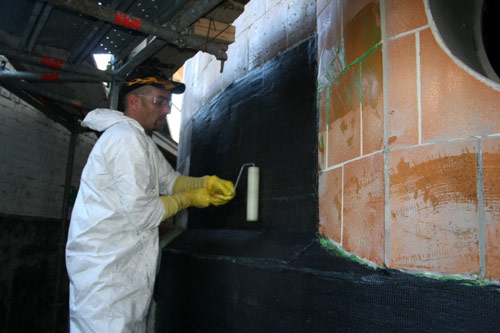 Concrete and tile structures are susceptible to spalling after years of weathering, freeze/thaw cycles and continuous operation in harsh conditions. Blome carbon fiber fabric systems and structural glass systems are highly effective for confinement of spalls, as they provide a corrosion-resistant exterior surface for industrial process equipment such as tanks, silos, chimneys, columns, beams, slaps and piping. These systems are typically installed in the horizontal (hoop) direction and eliminate spalling of concrete and masonry tile structures.